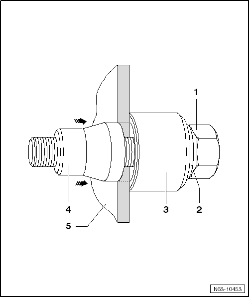• Position the hole stamper with the bolt head -1-, washer -2- and counterholder -3- on the inside of the bumper cover -5-.