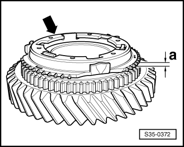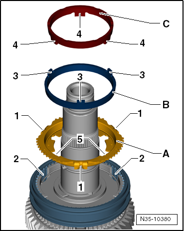 - Install the synchronizer ring -A- into the 1st and 2nd gear synchronizer